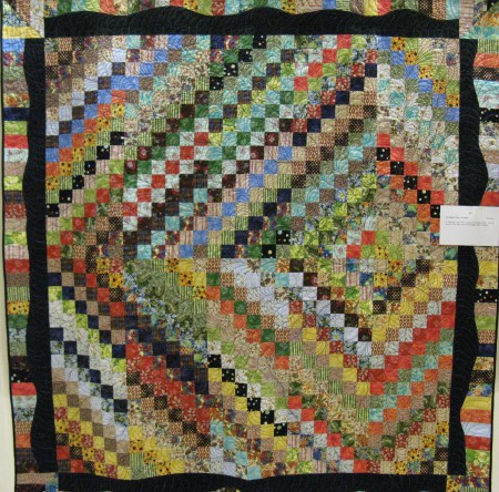 @play (pictured above left), Twilight in the Bronx, and Moon Over Manhattan come to mind when I begin thinking about color as the backgrounds are wildly different, as is the quilting. These are kind of obvious choices when thinking about how to use color differently. Then It’s Bigger Than I Thought nudges me to remember that the choices I made on this quilt weren’t the expected, I used a variegated brown for the quilting. Because of the color used for piecing the quilt there isn’t an obvious choice of a color for the quilting to go into the background. And interestingly enough when looking at the quilt from a distance the quilting does kind of blend in, but not so much.