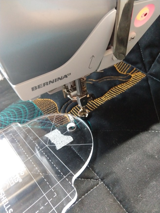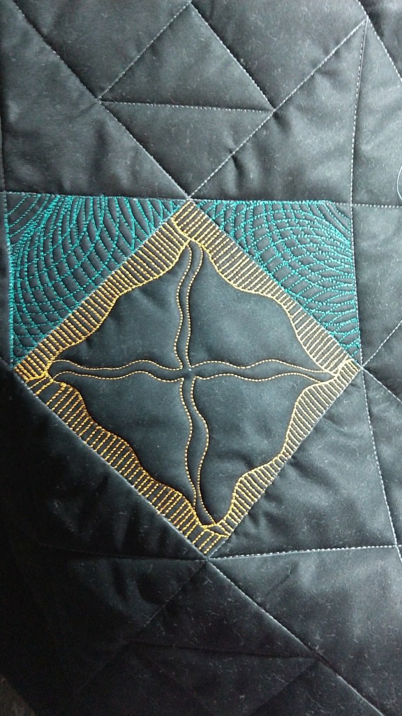 Just before I started the machine quilting I tidied up the table. I don’t know if you’ve stitched something to the back of your quilt because it was on the table and just stuck to the back of the quilt. Because this is going to a show I thought it prudent to tidy the table first. So the tidying begins and in the process I found the missing piece that I’d reconstructed. While the finding was too late, it was right on time for a bit of reflection. Sometimes the looking, and changing direction are part of the process.