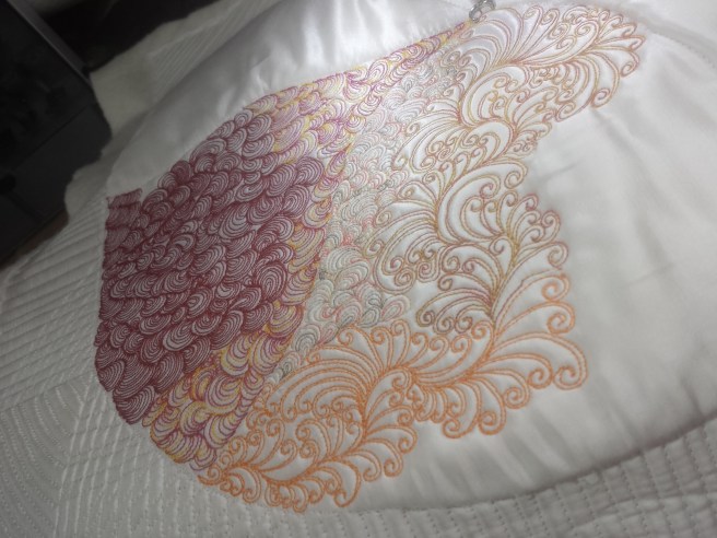 Like Jeanie shares beauty in photography and fabric, Leticia and Caralyn share the gift of beauty from great pain in their writing and in their living, I share beauty in machine quilting, out loud, recklessly using color to create something beautiful. Like Jeanie has images she doesn’t share or aren’t quite how she envisioned; like Leticia and Caralyn have painful experiences they don’t share I have those moments, places in my quilts, hard times that I don’t share. They do however, provide the depth of experiences that allow me to see great beauty. To appreciate it in the midst of difficult times, to trust that that little bright spot I see isn’t a train coming for me, it’s the candle providing light for the path I’m on.