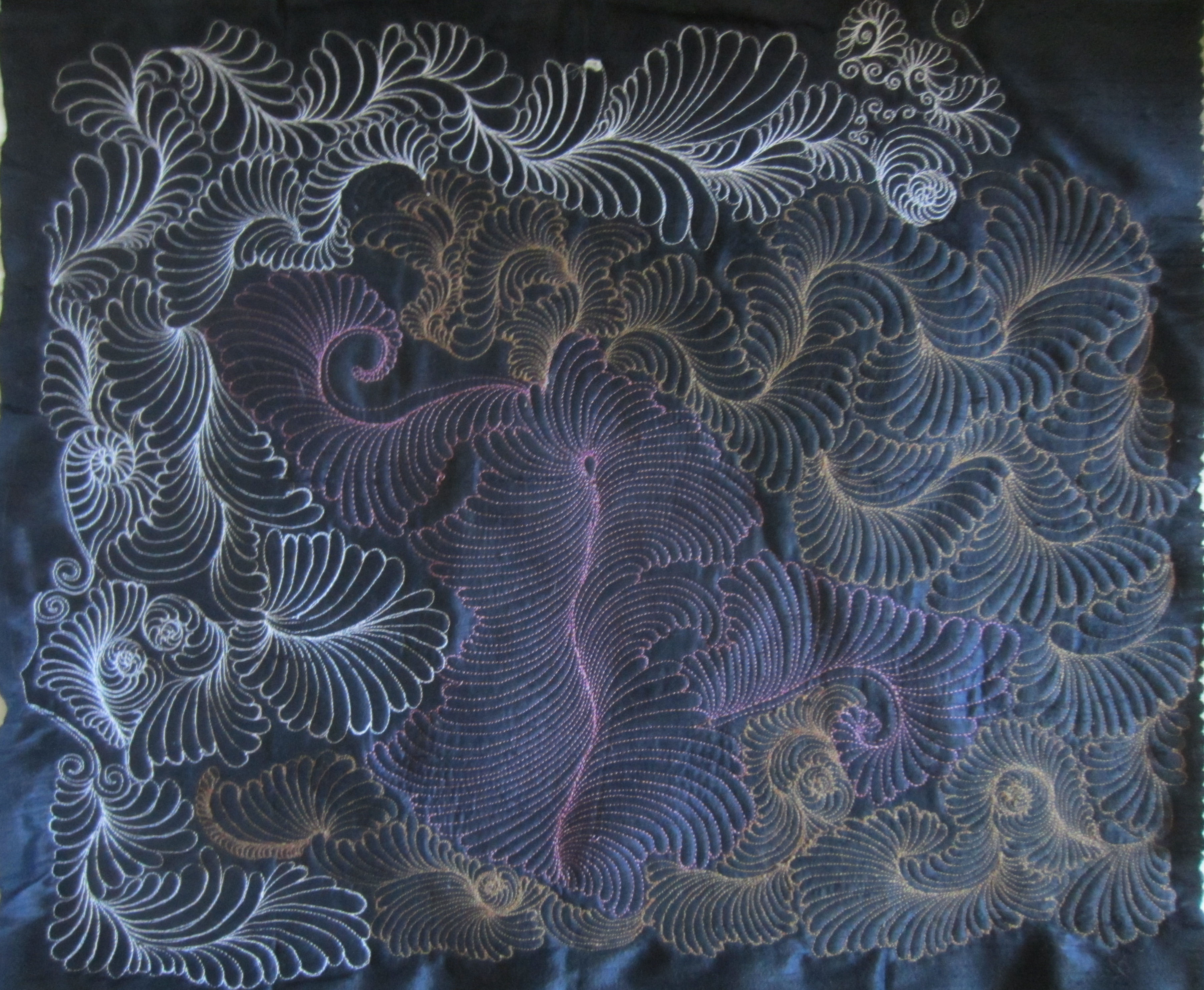 While listening to the interview, on Color with my publisher interviewing some of the coolest people in the quilting world, there are Yes! and aha! moments. They are in some ways giving words to my personal experience and helping explain how we, as quilt makers, work with color, looking for color value (light/dark). This affirmed that color relationships are relative, depending upon that they are near for us to understand that relationship. That understanding comes over time. For most of us as quilt makers this relationship grows strong roots in us and we are firmly planted in the value relationship with color. For some of us the relationship with color changes and we begin to use the color in our fabric and thread in a different way, more as a painter where we look for the fabrics to do what we want them to do rather than the fabric telling us what it will do. For some quilters this means dyeing, and still others it means painting the fabric to achieve the look and feel. For me this is choosing the thread color and weight to create the look and feel I’m going for, and often it’s an idea and if the idea takes an unexpected 227 degree turn, who am I to argue with it.