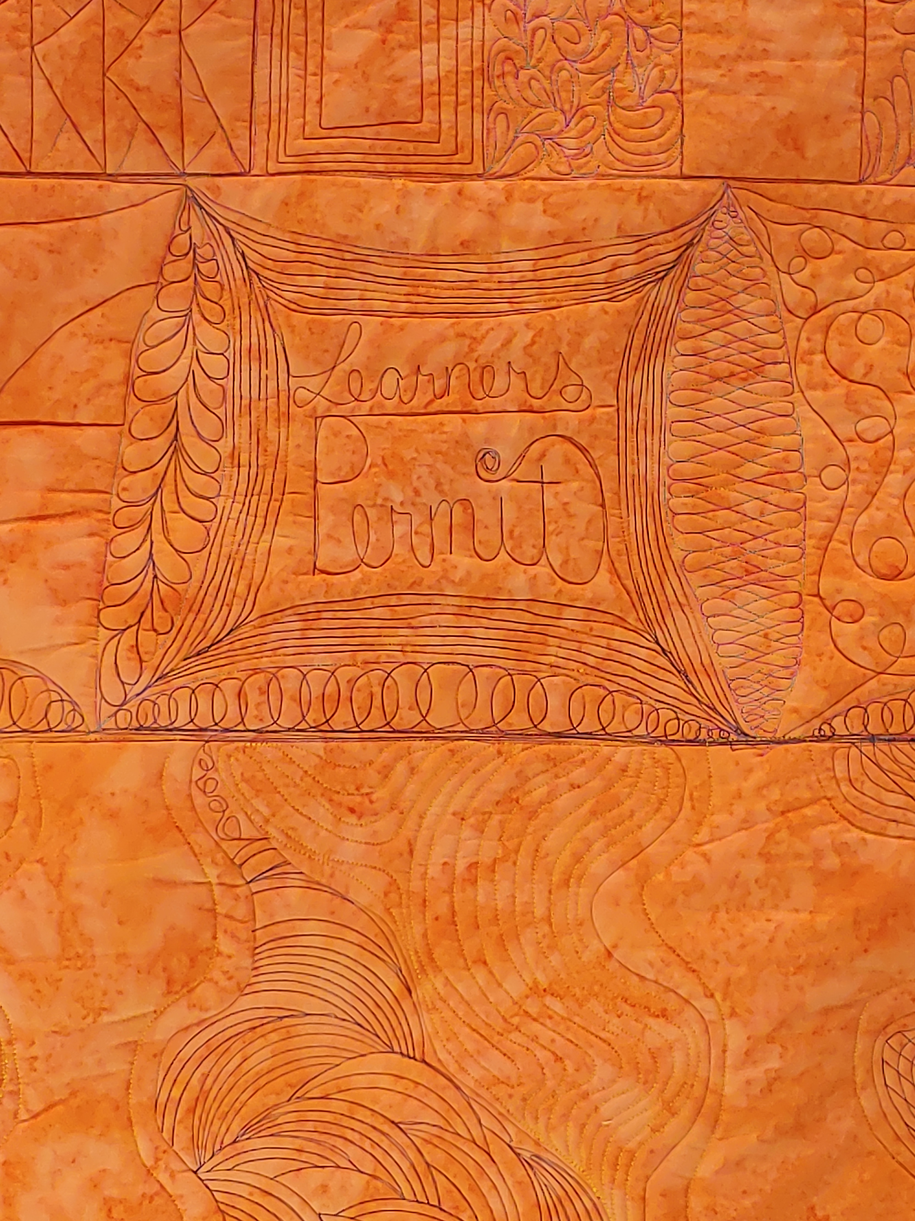 Learning to stitch with reckless abandon takes a bit of commitment and a wee bit of willingness to make a lot of mistakes and bad choices until the whole reckless abandon of it all takes hold. This, as you might imagine takes some really good foundational work, which is, in and of itself, my specialty. Coming to understand with experience how needles, thread, tension, doodling, good pens, spiced up with a willingness to let the quilting show is the key to unlocking this. Understanding how all of these work together takes a wee bit of time and a lot of experimenting. And it takes something of a critical eye asking questions like, “where did this all go right?” and “how do I do this again?” and “what if I try this?” and loud exclamations of “wow! Wow! WOW!” Not quite what you were expecting was it? I am really happy to share with you where all the flaws are in my quilts because there are flaws. However when standing back and viewing the quilt your eyes are likely to glide right over these places where the stitching jogs as a direct result of my hands moving awkwardly or starting/stopping with an a lack of smoothness that, to my eye, has a neon sign pointing it out or one of those big arrows with the words “flaw here” emblazoned over the surface so it’s clear that this is where the flaw exists. Each quilt has a multitude of these.