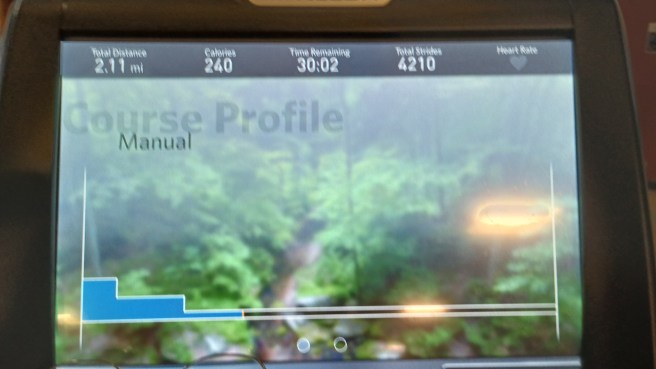 So here’s where the frustration has entered. It didn’t seem as though my body is both losing the weight and toning up as much as I thought it should be. Long story short I talked with the ladies at the gym today about my membership. For some reason I thought I started in April or May. Nope, end of June. Why does this matter, even a little bit? Well for one thing I thought I’d been at this getting healthy thing a lot longer. Well, at least longer anyway, where six to eight weeks longer does make a difference. Six months is good, and just beyond the beginning of the journey to get physically healthy. When I heard the date I started, June 25, I was a bit stunned and had the realization that I’m doing really well. Looking at the photo of the screen on the elliptical that day in 37 minutes I walked 2252 steps which works out to be about a mile. I can walk 4 miles, or a little over, in an hour. Or like today a little over 2 miles in 30 minutes.