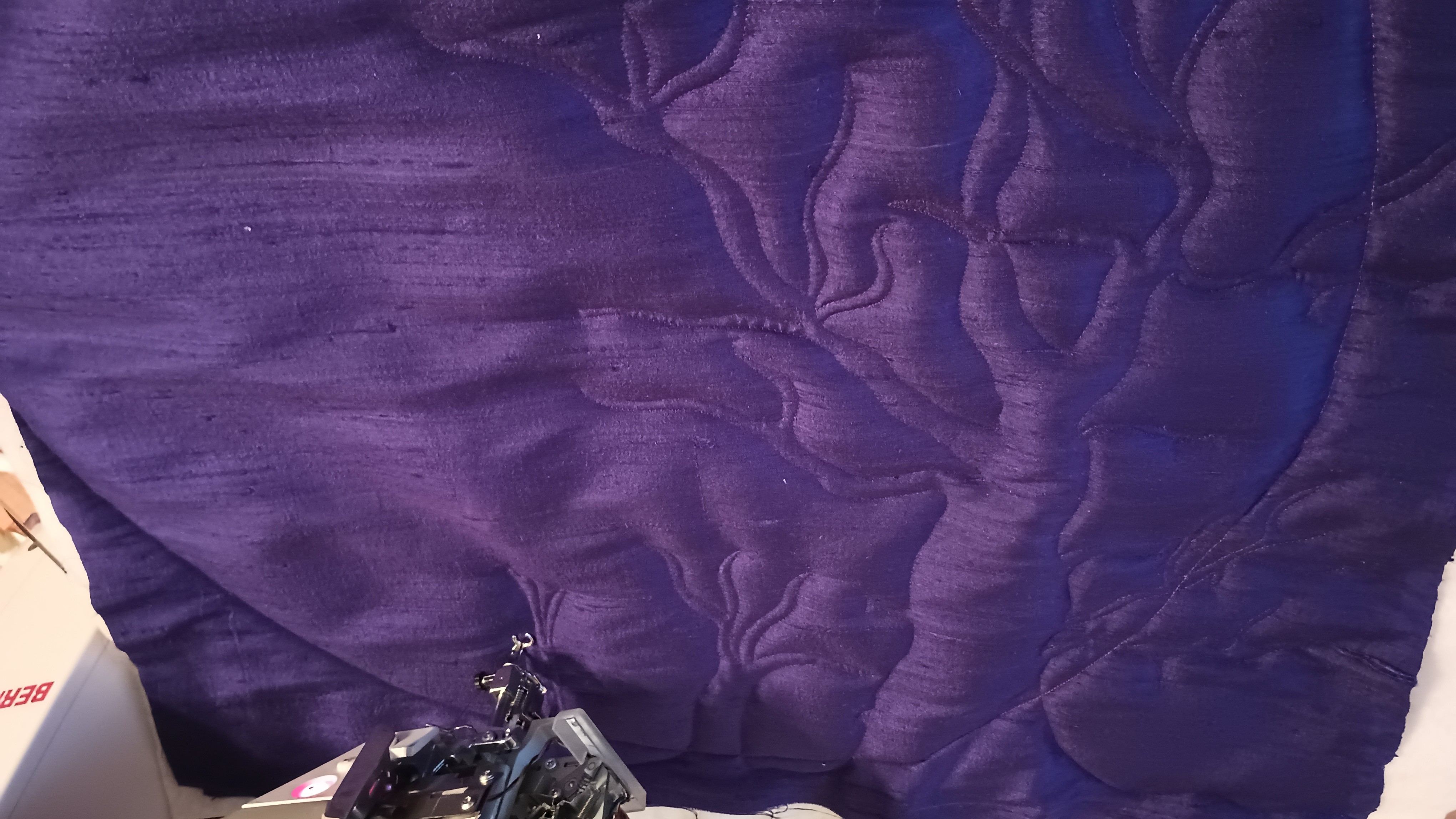 You might notice here that the image is actually upside down. This is because the quilt, a fat quarter of dupioni silk, is in the process of being quilted and the only way to get the correct orientation of the quilt itself was to turn the image upside down. Friends, for the first time in ages I’m quilting. I expected to be quilting something else and that is still on the ironing surface, all prepped and ready to go. This quilt is asking for the moon to be quilted in shades of red, orange, and purple like the eclipse several months ago. The trees are being left open and the space “behind” will be quilted. I have three pieces of dupioni, we’ll see what happens.