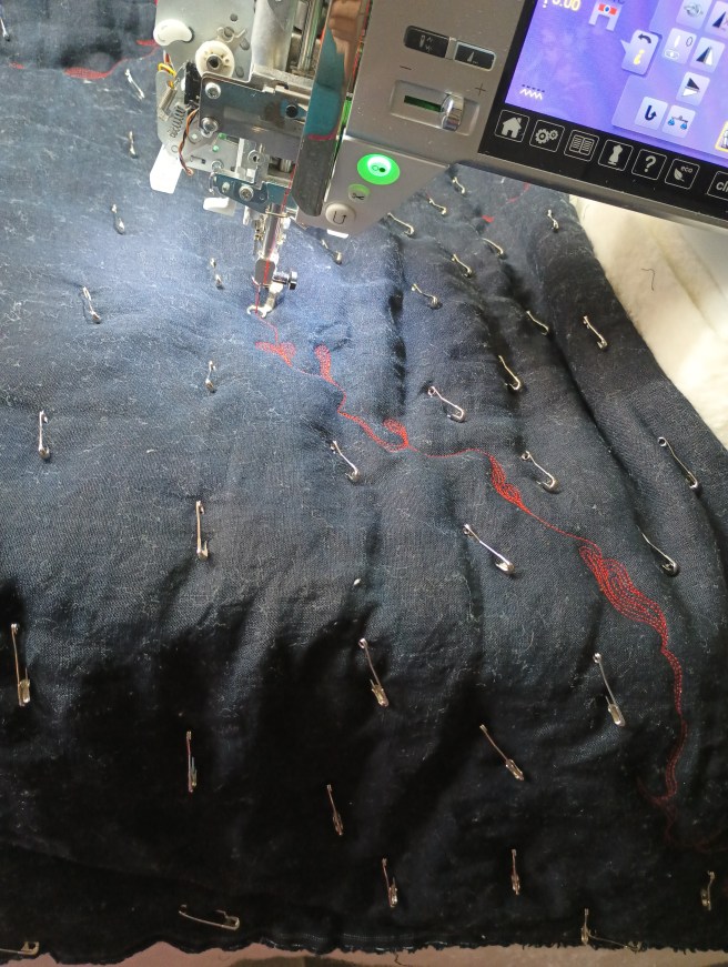. Here’s a bit of a sneak preview with where I’ve started stitching on the quilt. There are two layers of batting. While the light doesn’t show it well, this linen has subtle variations in color. It’s so, so beautiful.