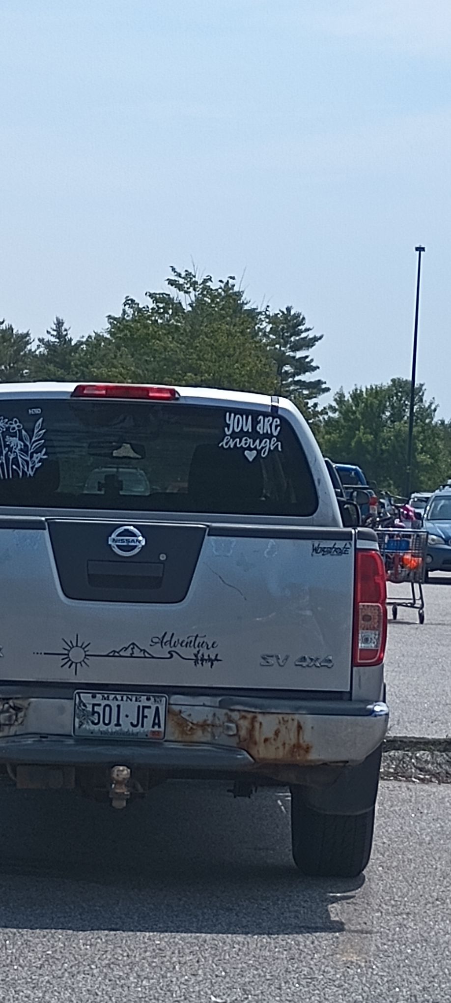 The other day I pulled into a store parking lot to see if I could find a power cord for my phone. I waited until the vehicle in front of me pulled away so I could pull into that spot, making leaving a little easier. That’s when I saw this sticker on the back of a truck and giggled. The night before my sister and I were talking about this very thing.
