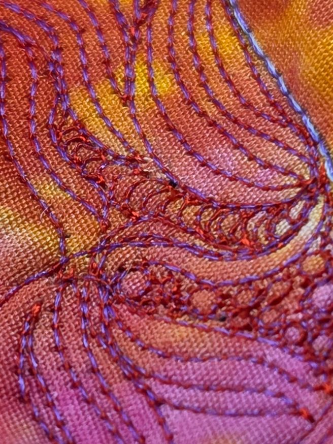 As a quilter balanced tension is a desire, goal and requirement. It took a while to learn to balance tension on my machine, particularly when using different thread weight through the top and in the bobbin. In the photo to the left the tension is balanced though the way the light hits in a couple of spots it looks like it’s not. One thread is a shade of purple the other a shade of red. (Shade is used in the broader sense of a part of a color rather than the finer sense of a color deepening through black,)