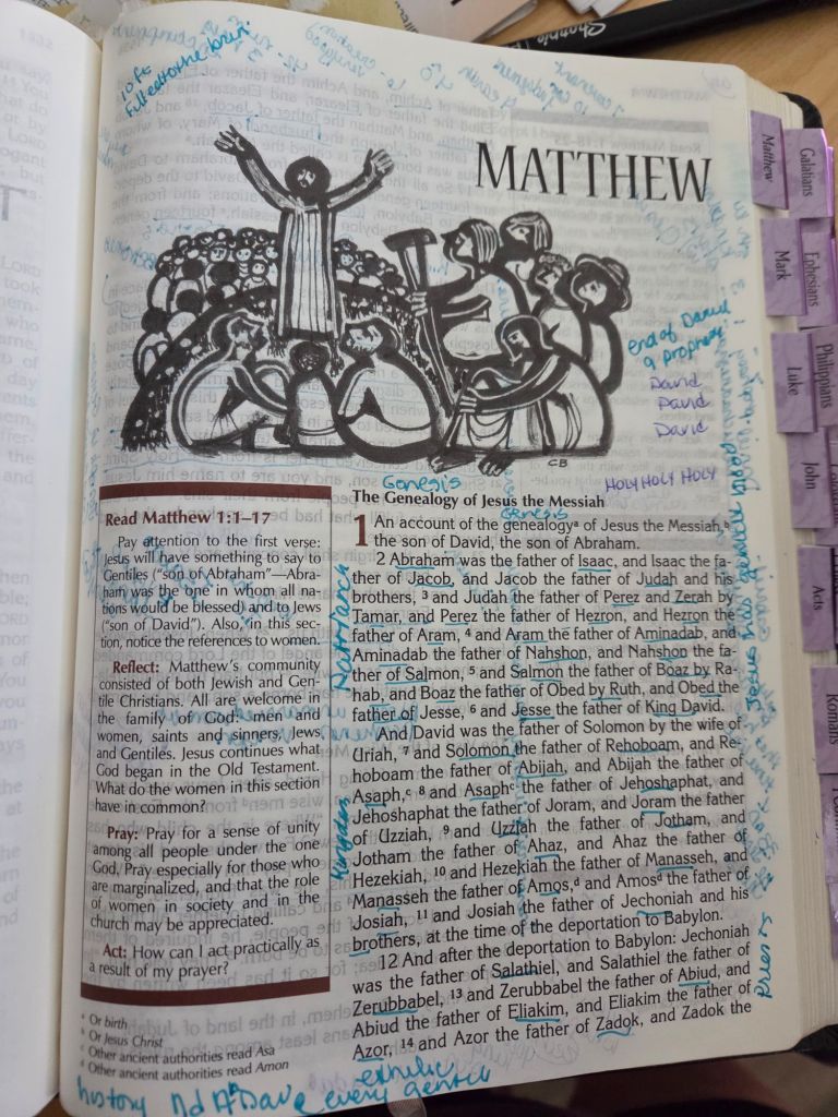 This is often affirmed in expected places. At the parish I’m part of the Discipleship University team, and choosing to, by both desire to learn and better form the teaching aspect of what I do, attend the Scripture Studies taught by Andy. These four weeks we are studying the Infancy Narratives in Matthew and Luke. (John and Mark do not include Jesus’ infancy) Making notes in my Bible is nothing new.
